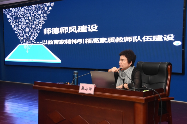 北京航空航天大学博士生导师姚小玲教授以《师德师风建设—以教育家精神引领高素质队伍建设》为题作讲座。姚小玲教授以“好老师的三种境界”为切入点,从“弘扬教育家精神、建设高素质教师队伍”“弘扬教育家精神,推进师德师风建设”以及“培育教育家精神的路径与对策”三个方面做了精彩的报告,解读了习近平总书记关于师德师风建设的系列重要讲话精神。同时姚老师指出教师应具备师德、语言和共情三大素养,鼓励各位参训教师坚守德行,做到知行合一,深入浅出地阐述了对教育家精神重大意义和丰富内涵的认识理解。讲座内容丰富、思想深刻、触动内心,既有理论高度,又饱含现实意义。