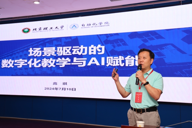 北京理工大学自动化学院高琪教授作《场景驱动的数字化教学与AI赋能》讲座。高琪教授结合实际教学案例,展示数字化教学和智慧课堂的建设与应用,与在场教师探讨技术驱动和场景驱动在数字化教学和智慧课堂应用中的选择,及数字化技术帮助学生取得更好学习成果的方式方法。他以“同伴教学法(Peer Instruction)”的实施为例分享数字化在促进教育教学进步中的有利作用。