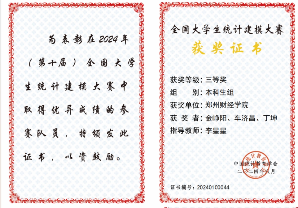 比赛启动以来,在学校教务处大力支持下,统计与大数据学院高度重视,广泛动员,认真筹备,共组织25支本科生团队参赛,学院遴选组建统计建模竞赛指导教师团队,对学生进行培训和指导。经过选拔,共有15支本科生团队晋级河南省赛,其中,3支团队参加省赛答辩环节。经过省赛的激烈评比,参赛团队以新颖的作品选题、科学的统计方法、严谨的内容设计赢得了评委的一致肯定,并获得省一等奖3项、二等奖3项、三等奖4项的优异成绩。一等奖的3支队伍因名次靠前,入围国赛资格,最终获得国赛二等奖1项,三等奖2项。