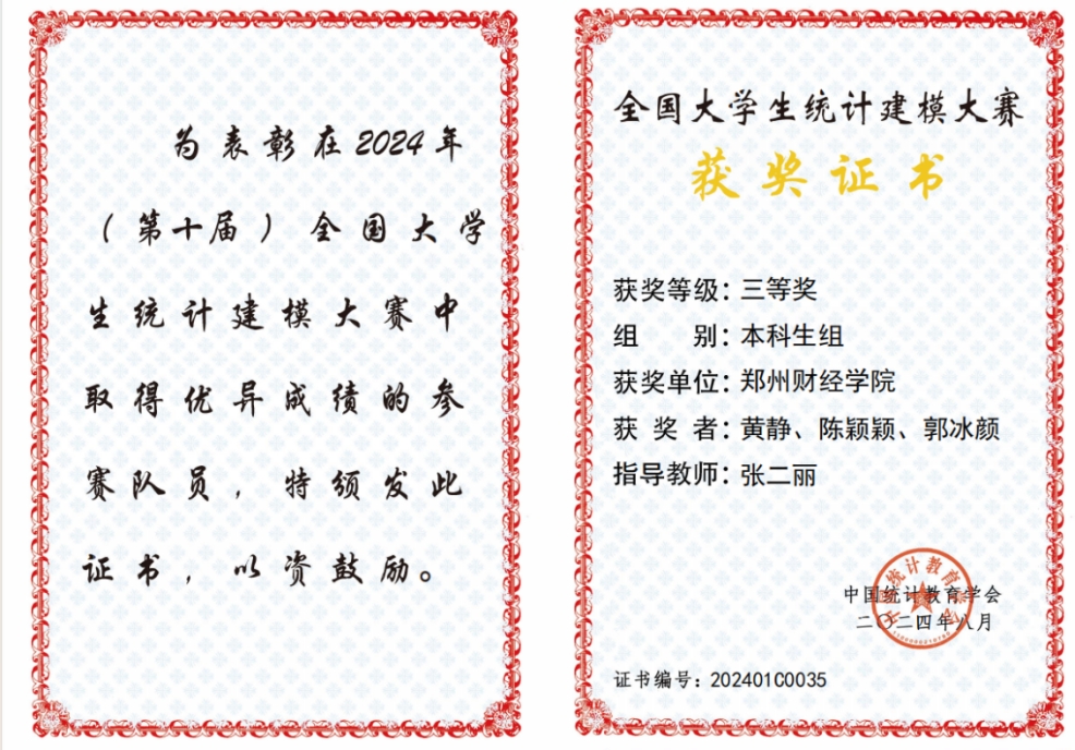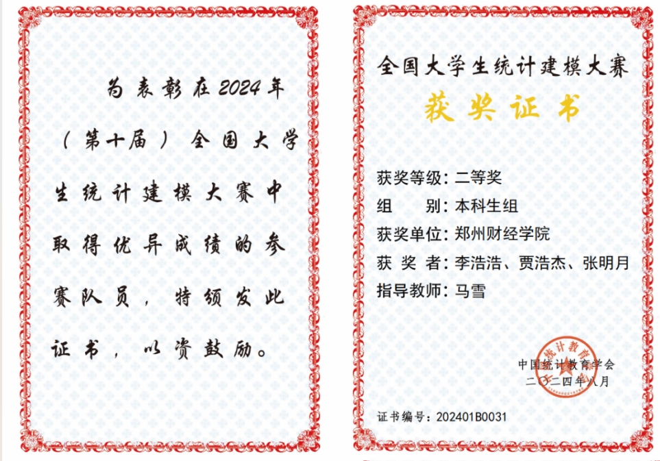 近日,2024年第十届全国大学生统计建模大赛成绩揭晓,我校在大赛中喜获佳绩,分别获得国赛二等奖1项,三等奖2项;河南省一等奖3项,二等奖3项,三等奖4项,获奖等级、数量位居全省同类院校前列。