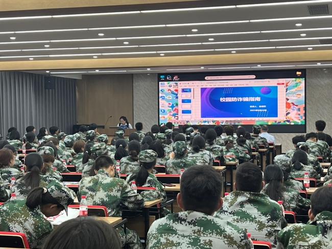 建设银行工作人员徐佳欣向同学们介绍了校园防诈骗指南,蔡学超警官进行反诈骗知识宣讲,并列举实例告知同学们在日常生活中要小心谨慎,不上当受骗。学生们聚精会神地聆听,并积极与主讲人进行互动,活动现场气氛热烈。